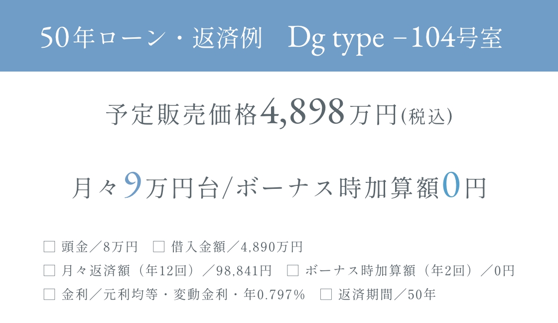 記載の返済例はDgタイプ(3LDK、専有面積71.25㎡)104号室/予定販売価格4,898万円、頭金8万円、借入額4,890万円、月々元本4,890万円、ボーナス元本0万円/元利均等・変動金利・年0.797%