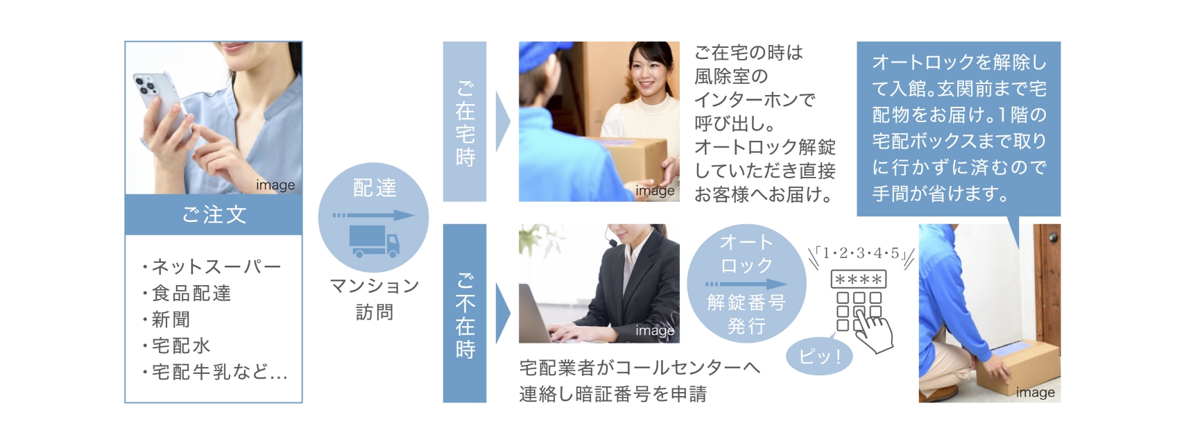 居住者が不在時でも提携の配達事業者がセキュリティを確保したまま、