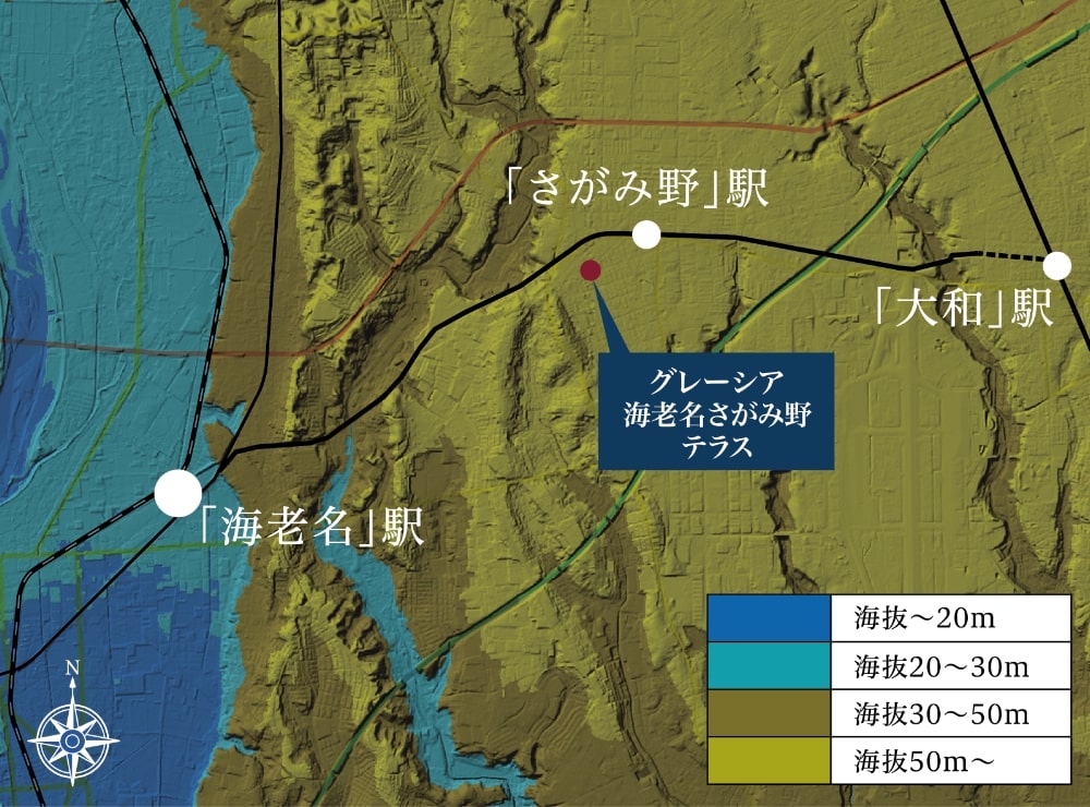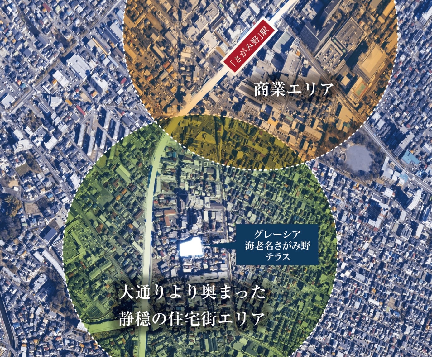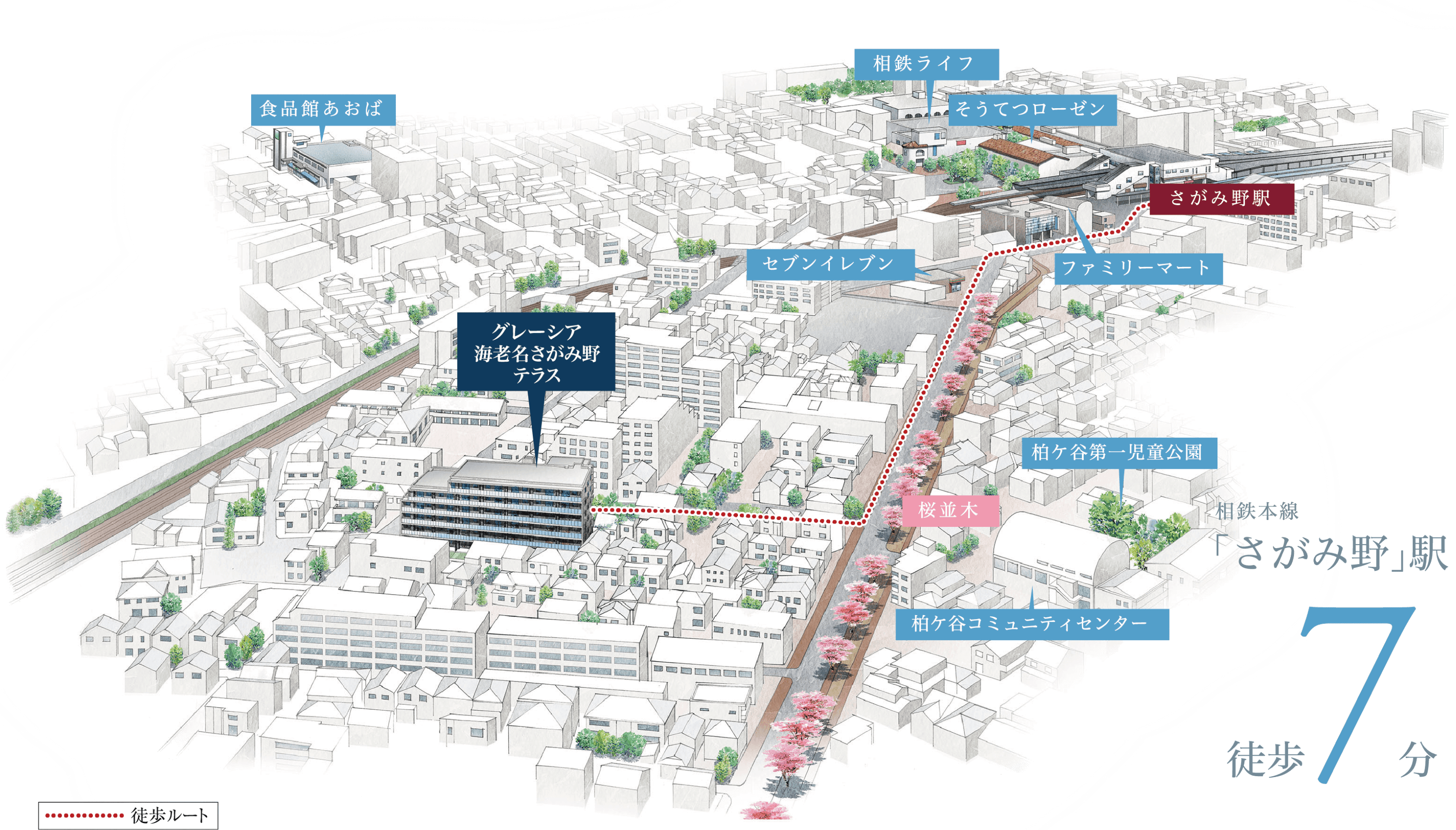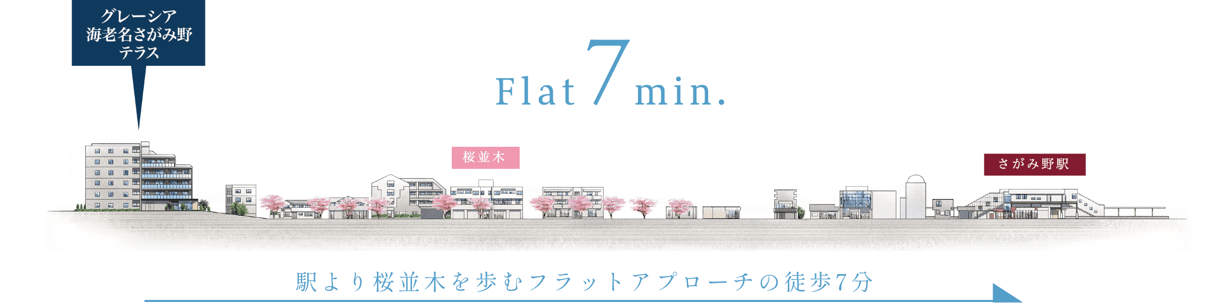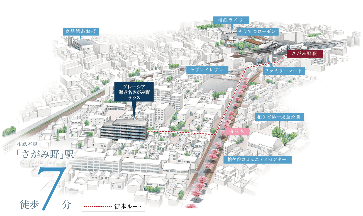 「さがみ野」駅前の賑わいから少し離れ、桜並木の美しい風景に寄り添う静かな住宅地。
