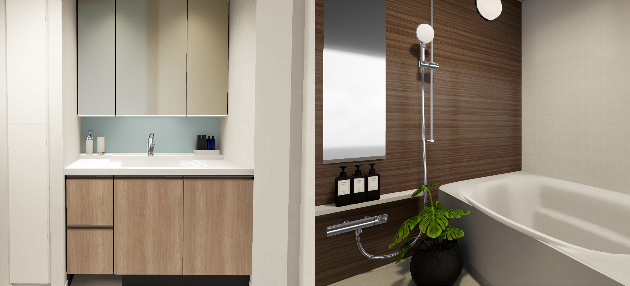 左:洗面室完成予想CG 右:浴室完成予想CG