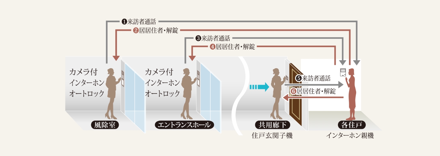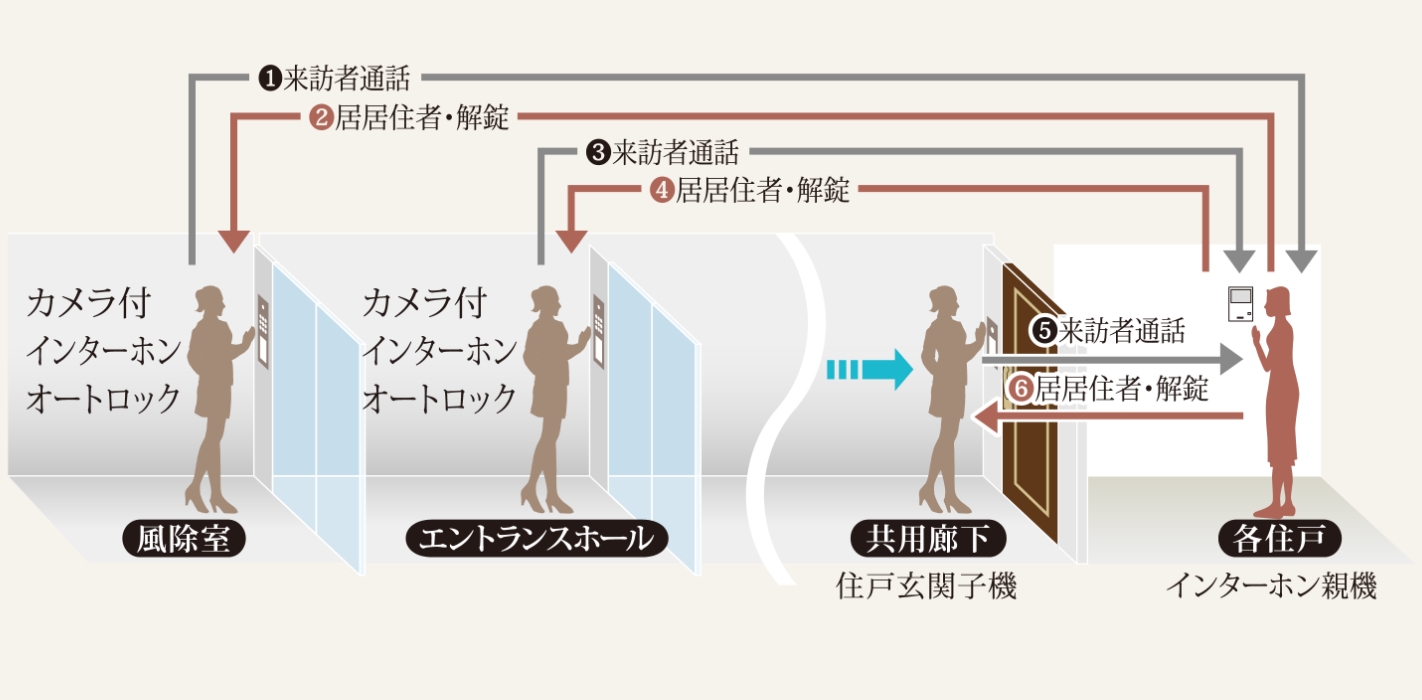 風除室とエントランスホールのオートロックは、各住戸に設けたカラーモニター付きインターホンと連動。来訪者の姿と声をカラー画像と音声で確認した後、住戸内から解錠できます。