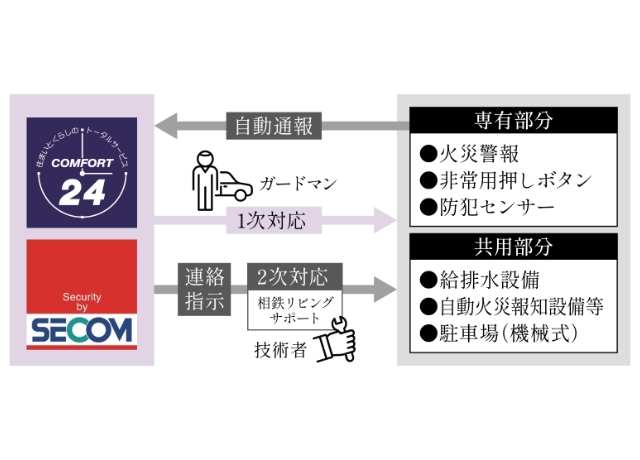 オンライン監視による24時間セキュリティシステムを採用。マンション内および各住戸に設置された防災・防犯センサー類が異常を検知し、管理事務室内のCOMFORT24警備システムを通じてセキュリティセンター(相鉄企業・セコム)へ自動通報。警備隊員が現地確認し、関係各所と連携を図り、日常の安全を守ります。