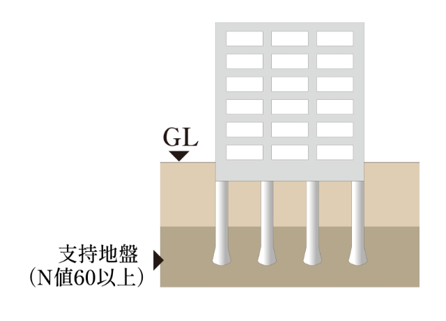 現地でコンクリートを支持地盤まで流し込み、杭の先端を強固な地層まで到達させる”場所打ちコンクリート杭”を採用。杭は先端を広げた拡底杭とし、その抵抗力によって建物を支える杭基礎を採用しています。