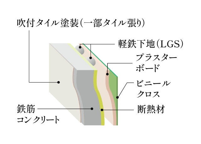 外部に面するコンクリート壁は約150mm~220mmを確保。内側には断熱材やプラスターボードなどを配しています。