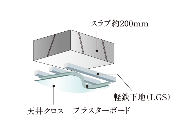 将来のメンテナンスやリフォームにも柔軟に対応する二重天井。ゴム付支持脚の採用により遮音性にも配慮しています。