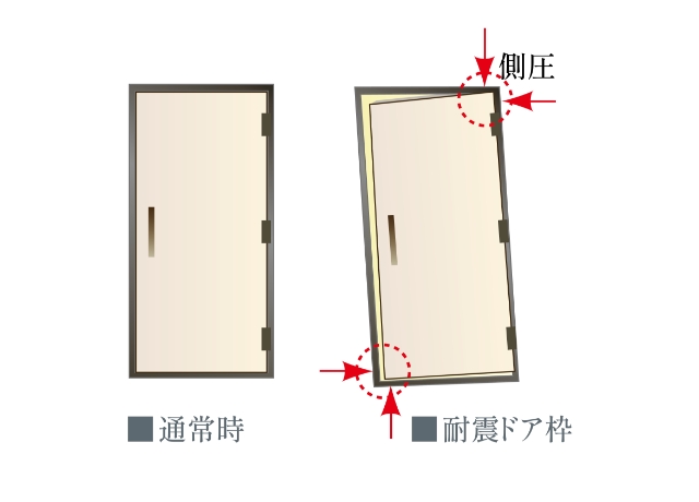 基準値範囲内における地震による変形でドアが開かなくなる状況を軽減します。※住戸玄関ドアのみ